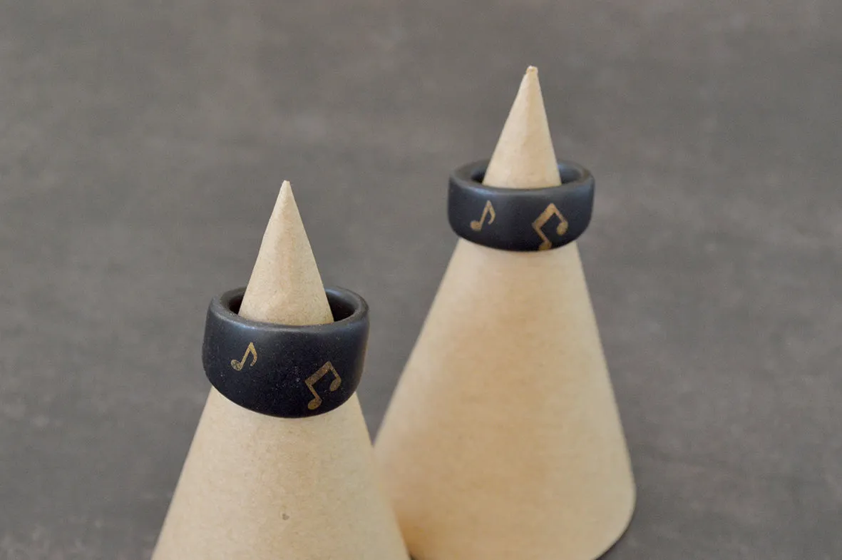 בצבע שחור מט עם איור תווים בזהב 24K. יתכנו שינויים קלים בין טבעת לטבעת.